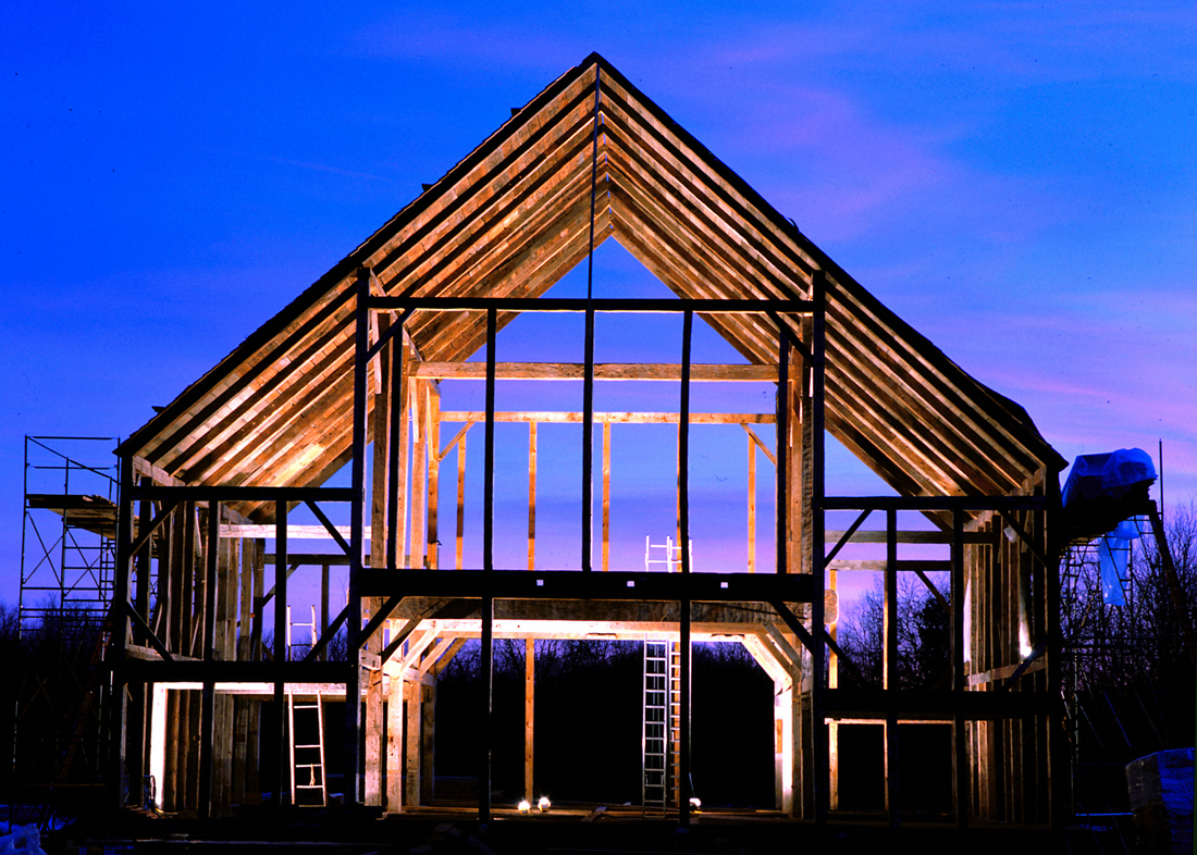 Much had changed in the barn’s 200-year history. Entrances had been added, beams had been cut to make way for windows and hay tracks, others had been undermined by moisture and rot and would have to be replaced. Mysteriously, the sidewalls had been raised several feet and the rafters shortened, reducing the pitch of the roof. (There are many theories about why this was done–it would have been an enormous undertaking–but the most plausible is that long ago the barn was hit by a violent storm, a storm so violent the roof was blown off and the rafters shattered where they met at the peak. In order to salvage them they would have had to been shortened and the sidewalls raised, which would have had a flattening effect on the roof line.) So one of the most difficult and time consuming parts of the renovation was lowering the sidewalls and restoring the rafters to their original length. It was worth the trouble though for we knew that when re-errected, the barn would have the same dramatic roof pitch it would have had when it first went up in 1799. (Note: the exact age of the barn was determined through a process known as dendrochronology.)